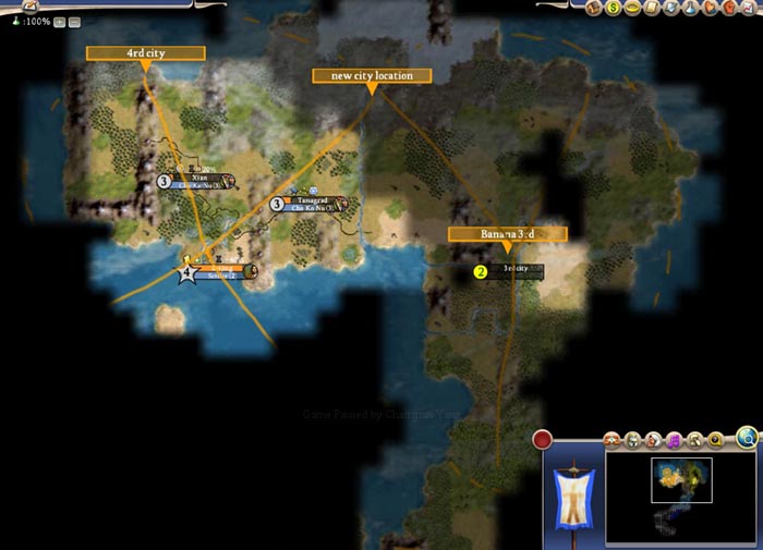 [2007.05.30. 23:51:48] bT : Banana 3rd city if we leave it intact will come productive in a few turns (2-4 likely), whereas we can quickly improve it and get set for production and commerce. Our 4th will be settled soon too