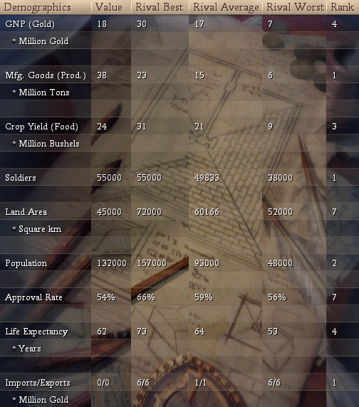 - We're being 4th in GNP (temporary setting while Oracle done) and first in Mfg goods with 38hammers/turn (second place - Sarantium, has 23).