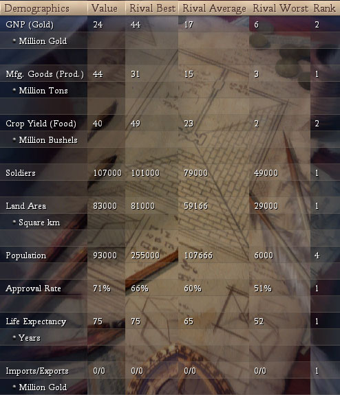 2.There are two very weak civs atm - one having only 3 Mfg goods, and other having only 2 crop yield. I'm thinking they are not the same, because at least Banana can have more mfg goods for that low crop yield and vice versa. That means Bananas are not the only ones who are going to die shortly. Furthermore, it appears Bananas are currently fielding at max 6 or 7 units (if that 6 GDP is theirs), which means 3 or 4 military units and 3 workers (unless they disbanded them which I doubt).