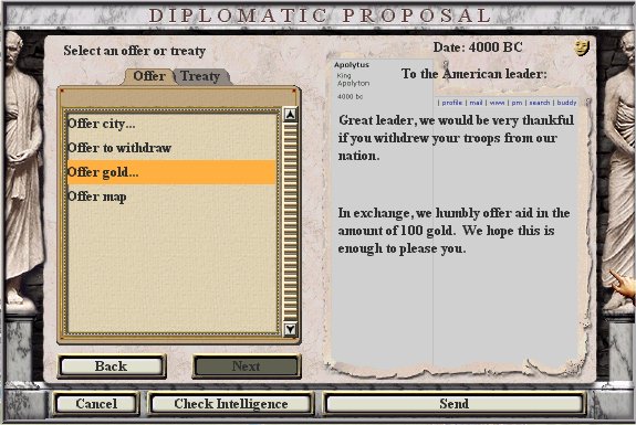 Cradle1.1 was an eye opener. First two games the Barbarians just wiped me out before 5000 B.C. Suffice it to say that single units wandering around looking for ruins will meet an ugly end right quick, and you better keep a few units in the home city....militia alone won't help. The third game lasted longer, but the result wasn't much different. Can you say AGGRESSIVE?! I'd played the first iterations of Cradle, and knew how dangerous the Barbarians are....but now it's the AI Civs too! Unlike normal games of CTP, starting "behind" is not a temporary situation! In my case, I was absolutely last on the power graph, and shared a continent with a nasty group of Mongols and a supposedly pacifist bunch of Indians. Of my 10 or so cities, the Mongols took one, the Barbs took my capital, and the Indians (with great huge smiles on their diplomatic faces) surprise-attacked me TWICE and took another five cities. Oh...and these guys were only 4 and 5 on the Power Graph! The only reason I even lasted this long is that I paid the Indians for some Bronze Age techs, but now they are coming at me with Legions and Composite Bowmen (I still have slingers for God's Sake!) and Heavy Cav.....so it's basically over. I could probably whine and play dead and last for another 500 years, but the idea of somehow winning this thing is laughable.