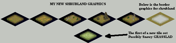 So far I have made the graphics for Shrubland and made one tile for another possible new terrain type which i havent fully decided on yet (possibly snowy grassland)