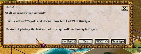 The main goal I had in mind with the updater was to get rid of the necessity to build new units and move them throughout my empire in order to replace the older units scattered on the map, a process I found painful in the later part of the game when you have many cities and units. This explains why I have not increased the cost needed to upgrade the units as I would like it to be rather easy. If you think these costs are too low you can edit the APOL_Updater.slc and increase them. You can also play with the govern.txt file in your CtP2 folder and increase the Unit Rush Buy costs in order to lower the gold resources of the human player (as suggested by Hexagonian in the thread I posted in the Apolyton CtP2 Forum before converting the cradle updater).