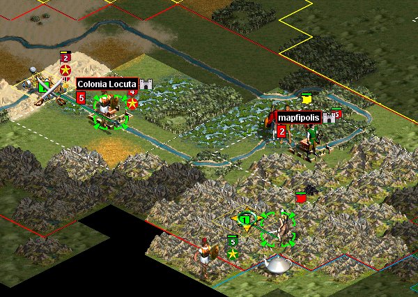 Here we have two problems one are the two Barbarian catapults, they seem to be damaged, but I want to go for sure and kill the two catapults with the defence force of four units from Colonia Locuta. After the completion of the mission the 4 defenders should return to Colonia Locuta.