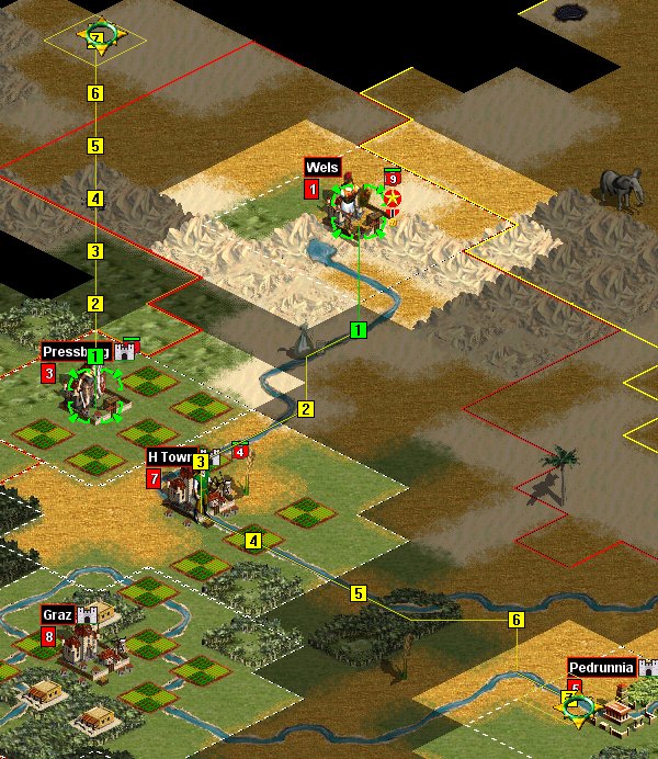 In Pressburg and in Wels we have parts of our troops that should be moved. In Wels we have the size 9 stack called Lemuforce that should be moved to Pedrunnia so that it can be disbanded in Pedrunnia, in case we need to rush the Ramajana. The Lemuforce needs 8 turns to reach Pedrunnia. According to this plan Wels will only have one defender left. That means that we will loose the martial law in Wels. The result is that the happiness level in Wels drops without a conquest disstress decrease to 69. The consequence is that the city will riot for sure next turn. Therefore the army should stay there one more turn. Next turn we will have then Drama and can compensate the happiness drop with two entertainers, as the city will also grow next turn if we keep the farmer in the city for one turn.
