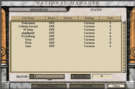 It takes between 4 and 9 turns to build a Caravan, depending on where we build it. Below is a screen that displays the costs of Caravans if we were to switch *right now* (overwriting existing build queues). Switching to Caravans right now may not be a good idea (that's for the Minister of Domestic Affairs to decide), but it gives an impression of the cost in each city.