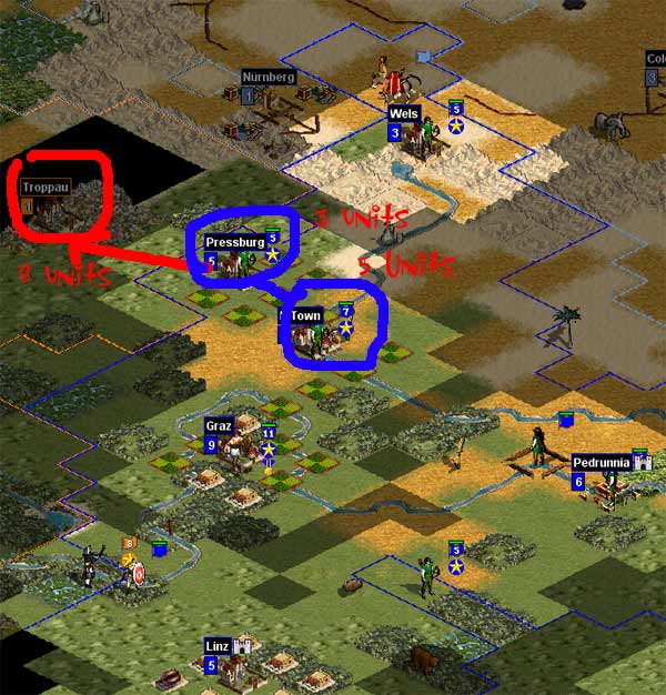 So the olan is to get 5 units from H Town and 3 from Pressburg leaving 2 units in Pressburg and 3 in H Town (1H to be built in 1 turn). . Joining those units together and attack Troppau with size-8 stack.