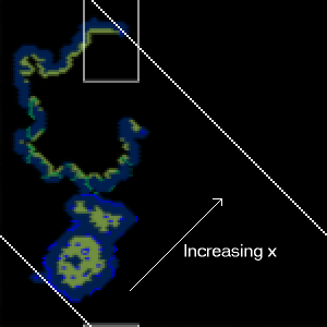 Yeah, J Bytheway is correct, that's exactly what I meant (the direction is right as well). And yes, Maq started out at x-coord 20 and when he got the feat he was at x-coord 21 and he had crossed all other x-coords...