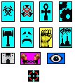 Is there a guide to all the little flags that appear next to a city? I can guess the sad face for unhappy, the fist for riots, but what is the blue flag with the gray circle with the black dot it the middle and the bue flag with the black checkerboard?