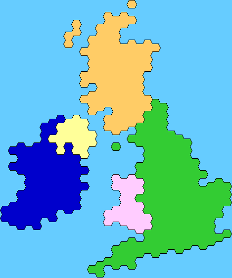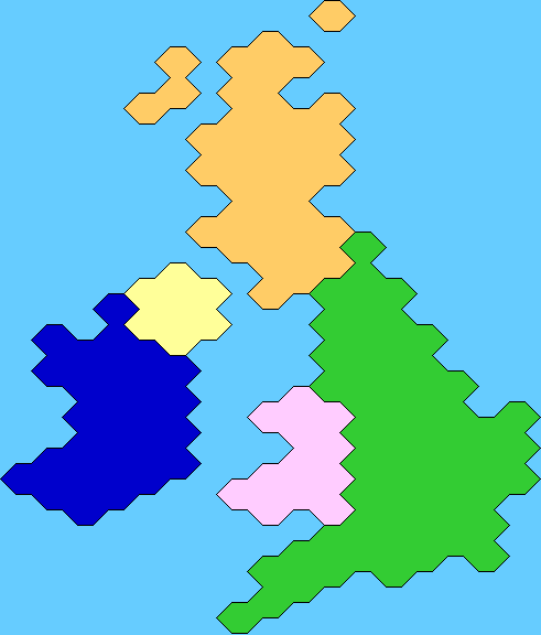 The previous compression is already quite handy, but it works well only with hexes (or rectangular tiles). If we want to use a totally free-form polygons, it requires a little bit more memory. One neat way to compress such polygons, however, would be use (x,y)-offsets just like I did with hexes before, but so that the offset can be more than just -1 or 1 in each direction. If we use 4 bits per coordinate, we can have offsets varying from (-7, -7) to (7, 7), and each edge would be a line somewhere in this 15x15 grid. If we decide to use a free-form map, I think this compression could be quite feasible. On the other hand, if we use tiles then it might be a little bit faster to use full bytes instead of groups of 2 or 4 bits, because computers (and programming languages) work with bytes.
