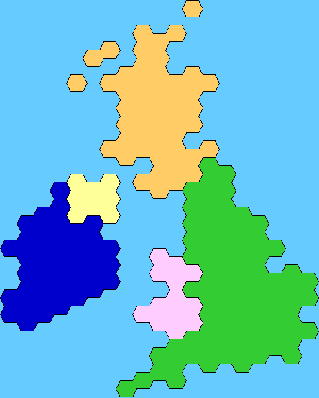I made a few calculations of my own, by the way. The purpose of these is to illustrate approximately where tiles might be more appropriate way of storing information, and when the opposite is true. I've thought about four possible levels of compression and named them min, med, max and uncompressed. The names refer to memory consumption so that min is the smallest possible, and uncompressed the largest (but perhaps fastest). The two first are basicly describing regions that are based on hexagonal tiles (just like Vet's example used rectangular tiles), and the other two are for truly free-form map. But more about that later.