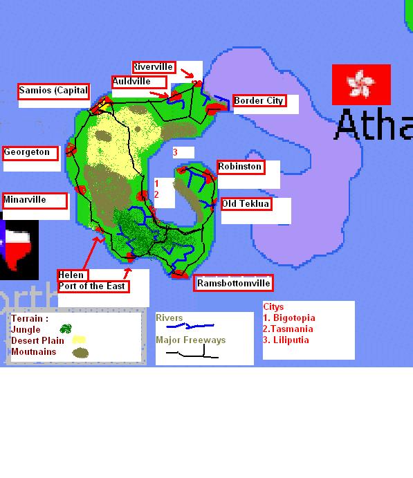 The army's shirt ninjas are the most feared assassins in the region, motorists must pay to enter inner-cities during peak hours, public nudity is compulsory, and military spending recently hit a new high. Crime -- especially youth-related -- is totally unknown, thanks to the all-pervasive police force and progressive social policies in education and welfare. Auldoninna's national animal is the gerbil, which is also the nation's favorite main course, and its currency is the banana.