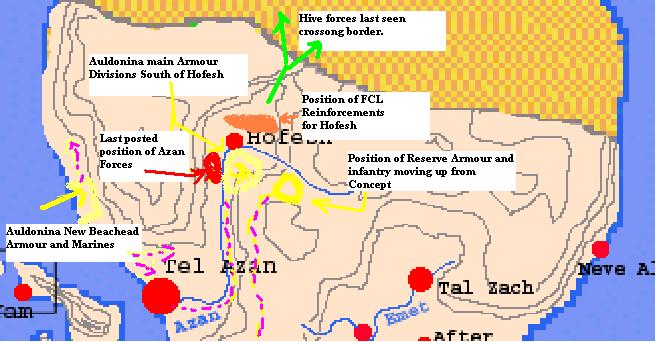 This was the largest attack since the beginning of the war. The town of Hofesh was not under control yet, as it had many Hive infantry in the streets and the recent movement of FCL oured battalions had strenthened them too.