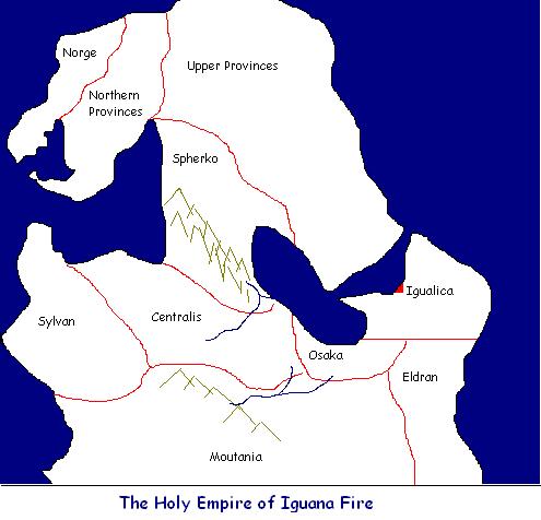 The Holy Empire of Iguana Fire is a tiny, economically powerful nation, notable for its barren, inhospitable landscape. Its hard-nosed, hard-working, intelligent population of 6 million are free to succeed or fail in life on their own merits; the successful tend to enjoy an opulent (but moralistic) lifestyle, while the failures can be seen crowding out most jails.