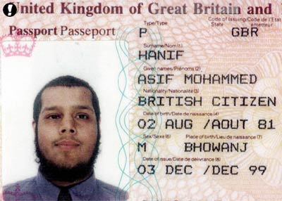 Authorities named the pair as 21-year-old Asif Mohammed Hanif, the first European suicide bomber of the Palestinian uprising, and Omar Khan Sharif, of Derby, who was still on the run last night.