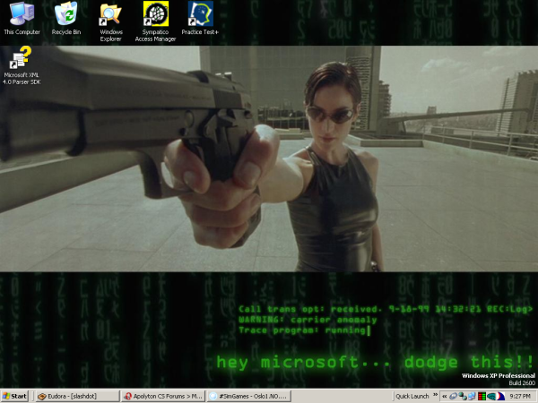 BTW... I'm considering moving away from IceWM, too. Currently my first virtual desktop looks like this: http://www.lyseo.edu.ouka.fi/~lighte...ktop-crush.png. Yep, that's a black screen. http://evilwm.sourceforge.net/ documents all the shortcuts I need for controlling my windows. It looks good this far. I'm now going to do some experimenting to see if I'm really going to like it...This is Shireroth, and Giant Squid will brutally murder me if I ever remove this link from my signature | In the end it won't be love that saves us, it will be mathematics | So many people have this concept of God the Avenger. I see God as the ultimate sense of humor -- SlowwHand