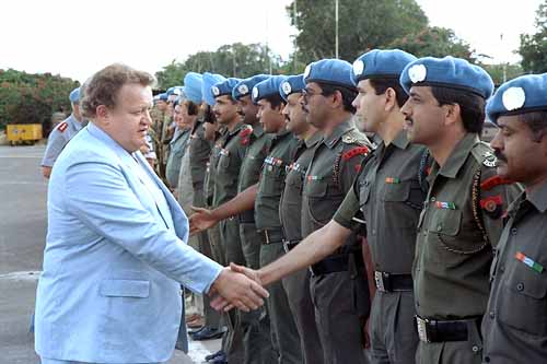 This was back in 1989, when he was Special Representative of the Secretary-General for Namibia, inspects a contingent of UNTAG police monitors from India at their base east of Rundu in the Caprivi Strip. He's much fatter now.