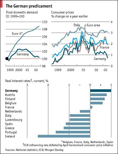 Deflation would be dangerous in Germany, given firms' heavy burden of debt and the fragile state of the financial system. Bank credit has already ground to a halt. Yet Germany cannot cut interest rates, because these are set by the ECB according to economic conditions across the whole euro area. Europe's stability and growth pact is forcing the German government to tighten fiscal policy too. Ironically, the rules for both the ECB and the stability pact were designed largely by Germany.