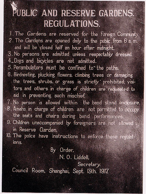 The sign, posted at the entrance to the HuangPu Park on Shanghai's Bund, listed many things that were banned in the park, among them dogs, bicycles, sports, picking flowers, and Chinese who were not servants accompanying westerners. Still offensive, but nothing like the infamous abbreviated "No dogs or Chinese".
