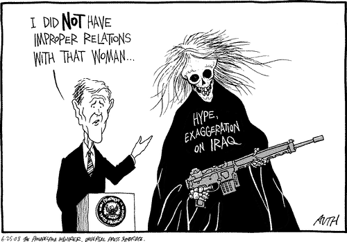 Barring the revelation of a signed memo by Bush saying "Hey, let's fool the fuking country!", this will be my last word on the whole Nigerian document thing. The latest story is this. The headline reads "Bush Knew Iraq Info Was False." So you'd expect some heavy sht, right? Instead, you have this: