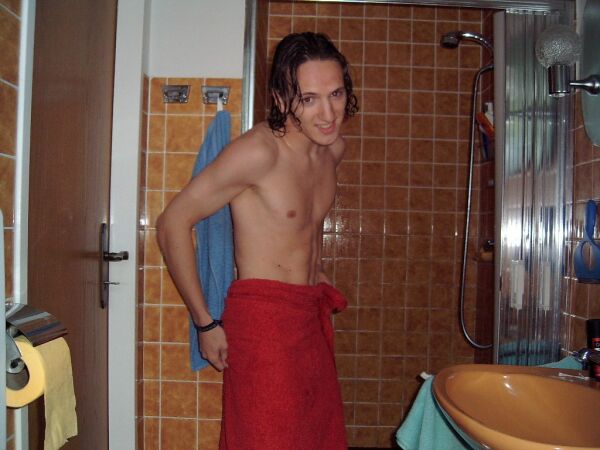 my hair is tied together in a pigtail, I usually wear clothes instead of the towel and I don't smile as much