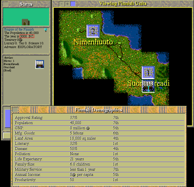 Käynnistin muuten sukkessiopelin CivNetillä, seuraavilla yksityiskohdilla: Valtion nimenä Finnish, Emperor vaikeustasona, 7 kivilikaatiota kokonaisuudessaan, random mappi, Turn-based moving, kinginä Jorma Ollila.
