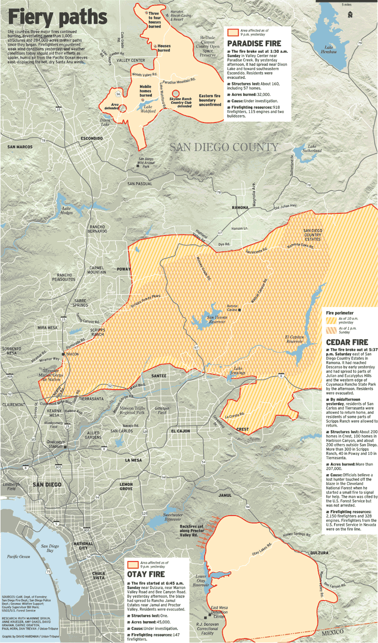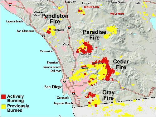 That's a great map. Where did you find it? Also is there one which shows the amount of damage the fires have caused in the mountains? I hear the Cleveland National Forest and Cuyamaca Rancho State Park have been hit hard.