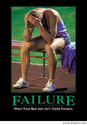 I have an idea. Maybe we should hold a contest, who fails biggest. I mean lets make it art.. art of failing. Lets take it to another level! Discover the new hights of loserism, and say NO MORE will I succeed or fail just a little. Oh no.. we will start failing like there is no tomorrow. And when we are gone, they will make songs about us and teach them to children and future generations of future.