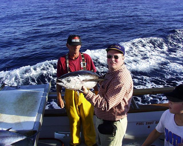 That's an average Albacore tuna. A nice bluefin is above 1000 pounds. They are almost extinct. But I'm kinda referring to the guy in the yellow trousers behind. He's like the Finns in Stockholm. I payed hundreds of dollars just to get on the boat, then he helped me with the fish before I found out he wasn't a true member of the boat crew. It was illegal for the passengers to clean their own fish, and this "expert" demanded 5$ per fish he cleaned. I refused to pay and gave my fish away to a local guy who did not catch anything that day.