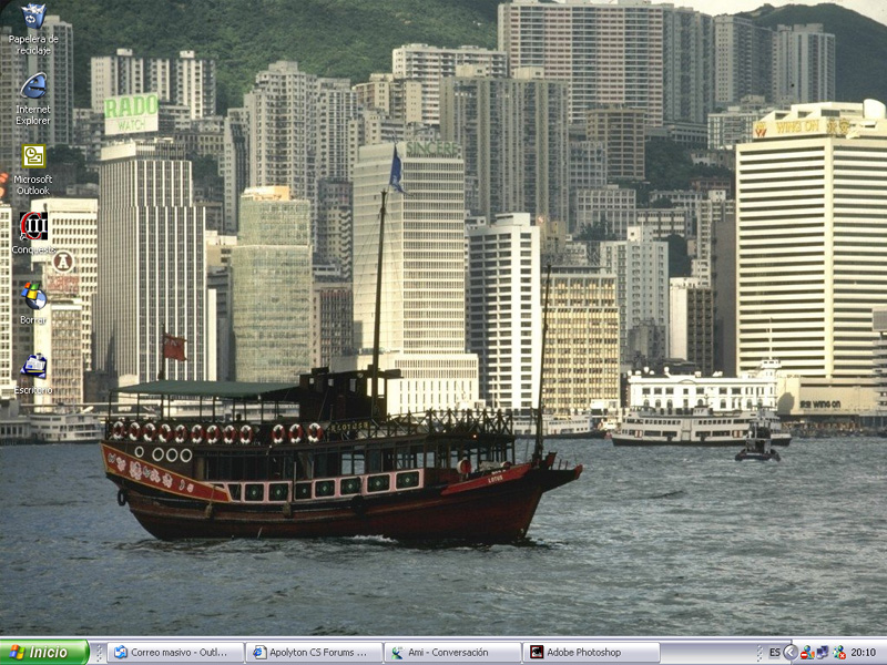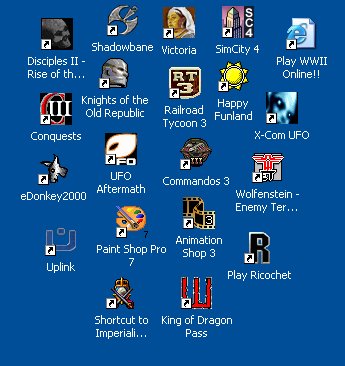 since there are no icons on my desktop (rather, since my desktop icons are part of my taskbar, a feature of XP, no icons are displayed) and my taskbar is on autohide, and my background picture randomly switches every 5 minutes from about 300+ or so pictures, posting a picture of my desktop is sort of meaningless.