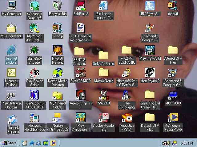 since there are no icons on my desktop (rather, since my desktop icons are part of my taskbar, a feature of XP, no icons are displayed) and my taskbar is on autohide, and my background picture randomly switches every 5 minutes from about 300+ or so pictures, posting a picture of my desktop is sort of meaningless.-connorkimbro