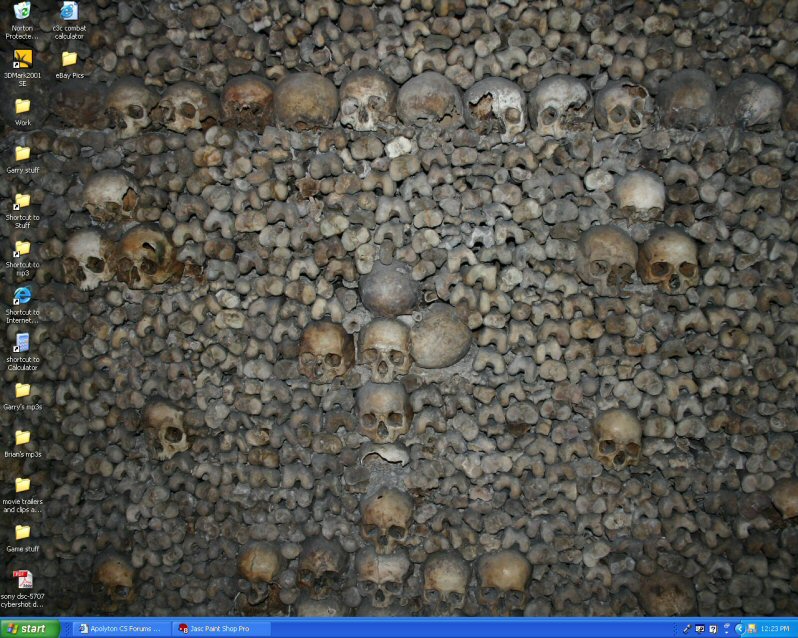 Well, you can a) go to Paris and take your own pic, b) do a search for Paris catacomb and find pics online, or c) I can be a mensch and e-mail you a copy of the pic. PM your addy to me and I'll send one over. Notify me of any size limitations (BMP is 4.5 MB, JPG is 331 KB).