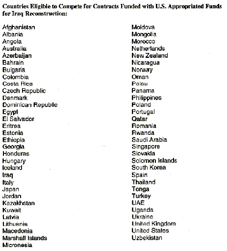 The administration had warned before the war that countries that did not join in an American-led coalition would not have a voice in decisions about the rebuilding of Iraq. But it had not previously made clear that companies in those countries would be excluded from competing for a share in the money for Iraq's reconstruction that the United States approved last month."