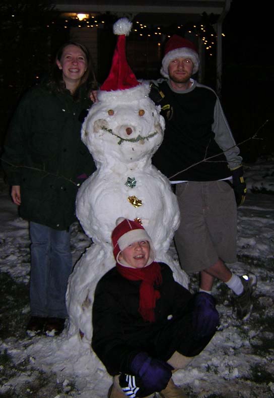 Here is the great Ozzy posing with my cousins in front of our snowman we made on Christmas eve. In true Apolytoner fashion, I of course, am wearing my Santa hat. Took with my brand new digital camera.