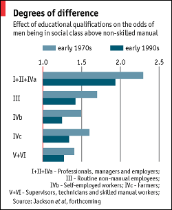 Why should the impact of education on social mobility be declining? Because, according to a forthcoming paper* by three academics at Nuffield College, Oxford, employers are becoming less interested in educational qualifications. That's happening for two reasons. Part of the job of higher education is to send a signal to employers—that someone has learnt to think, to persevere, to absorb information and to present ideas. As the supply of graduates grows, and the quality of teaching in Britain's shabby, crowded universities declines, this signal is fading. At the same time, services have been growing at the expense of manufacturing, and, increasingly, the qualities that employers in the service sector want are those the middle classes acquire at home: articulacy, confidence and smartness.