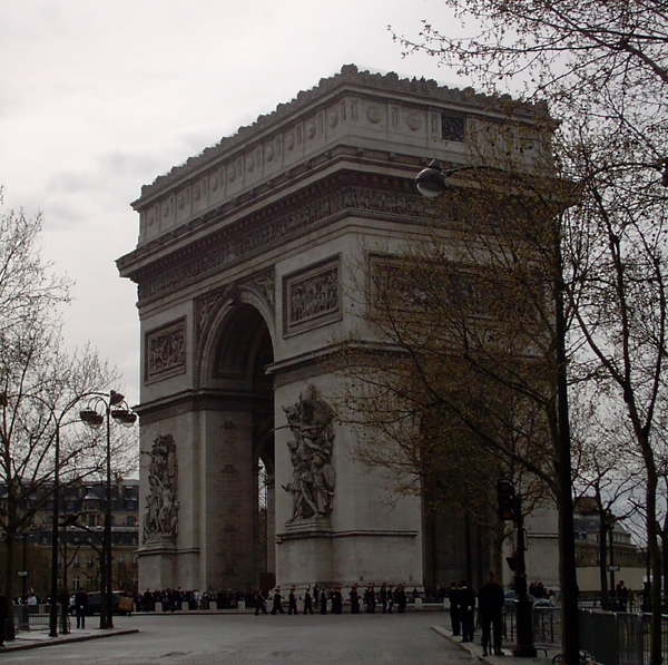 And the last one I'll post, the Arc de Triomphe. When we arrived via the Metro, our chosen exit onto the Champs d'Elysees was blocked and we were routed all the way around the circle to an exit at the far end. When we emerged, we realized why: Queen Elizabeth II was in town, and her motorcade had just arrived for a visit to the Arc and for her to saunter down the avenue. You can see in the pic a French honor guard marching around the monument. Matt asked if I wanted to get a picture of the Queen, and I said "sure, go stand in front of the Arc and I'll take one." He wasn't amused.