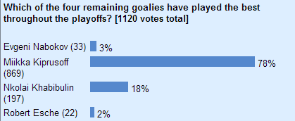 You post a poll from a Canadian website, and stroke yourself because it shows that Canadians think that the goalie on the only remaining Canada-based team is playing at the highest level? Big ****ing surprise.