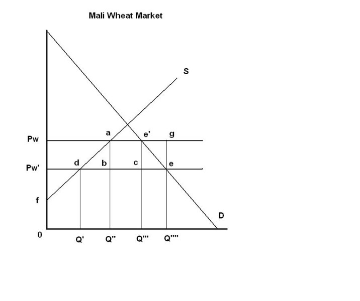 Now the subsidy is removed. Supply shifts upward to the true world price, Pw. Equilibrium is now at e’. Domestic production increases from 0Q’ to 0Q”. The revenues of farmers in Mali increase to 0Q”aPw, and their profits increase from fdP’w to faPw. Imports decline from Q’Q”” to Q”Q”’. Consumers in Mali now pay abce’ more for their imports of wheat, an amount equal to the savings to foreign taxpayers, who no longer have to pay for the subsidies. From the worldwide point of view this is a wash. Overall consumption of wheat declines from Q”” to Q”’ as consumers in Mali react to higher wheat prices. There is a net loss of $e’ce for Mali consumers who no longer buy wheat. But there is a net gain of $e’ge worldwide because world producers are no longer producing wheat at a price greater than what consumers are willing to pay for it.