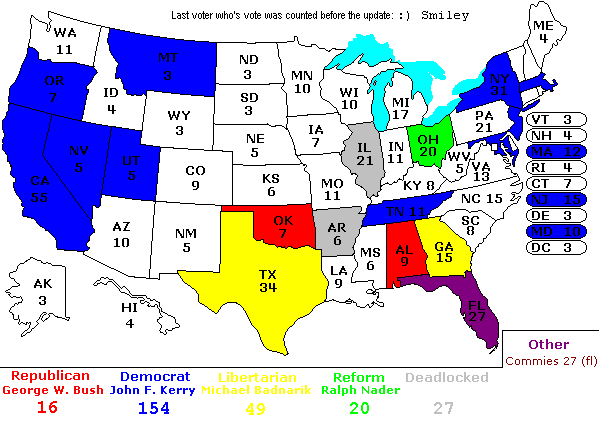 Come to think of it, there was no rule about only voting once. So, on my cross country trek next week, guess I can log in on the road! Kerry will carry PA, OH, IN, IL, WI, MN, SD, WY, ID and OR!