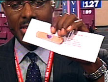CNN's Dan Lothian holds one of the "purple heart" bandages.