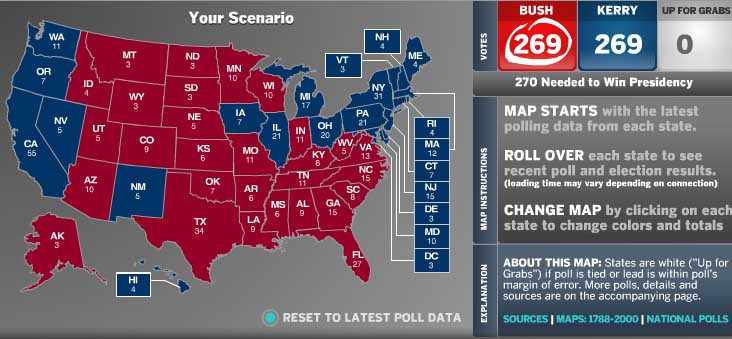 According to the really neat election map the LA Times has, and their polling data, the win goes to Kerry. Here are some states I transcribed for y'all, based on the most recent polling data available.