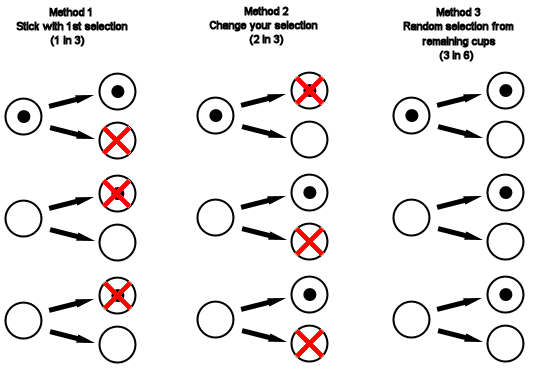 2. Switch to the other cup (2 in 3 chance of success) or