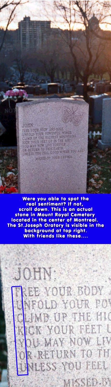 Either this guy was a serious ***** in his lifetime, or he and his friends really had a great, though morbid, sense of humour. I like to think it's the latter.