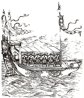 Model of a Ming Dynasty anti-ship cruise missile. The four rockets (probably angled downward) propelled the missile as it skimmed the surface towards its target. When it neared the enemy ship, a time-delayed fuse ignited a volley of rocket-propelled arrows which burst forth from the mouth.