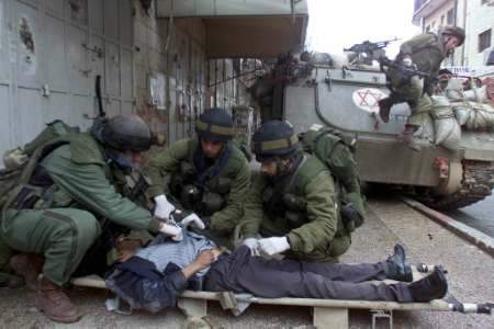 The evil Zionist occupiers helping a Palestinian wounded civilian.