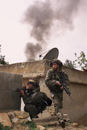 Israeli soldiers on the move. This is the "right" way to do it: One of them stays in position to cover his buddy as he moves.