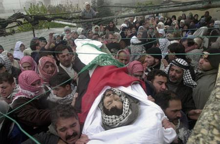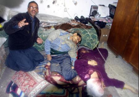 Sami Abdeh sits near the bodies of his brother Khaled Abdeh, 37, and mother Samieh Abdeh, 64, at their home in Bethlehem Wednesday, April 3, 2002. The two were killed in their home Tuesday during a heavy exchange of gunfire between Israeli troops and Palestinian gunmen. Sami said they died from Israeli gunfire and that Israeli troops prevented ambulances from reaching the home, and the two bled to death.