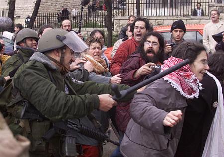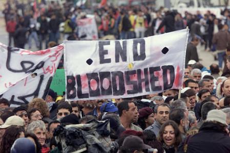 A banner calling for an end to the bloodshed is seen as more than 2,000 Israeli activists, Jews and Arabs, try to pass the A-Ram chekpoint between Jerusalem and Ramallah, Wednesday, April 3, 2002. The demonstrators were trying to deliver humanitarian supplies to the besieged West Bank town of Ramallah and were also calling for an end to the bloodshed."Politics is to say you are going to do one thing while you're actually planning to do someting else - and then you do neither."