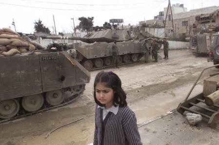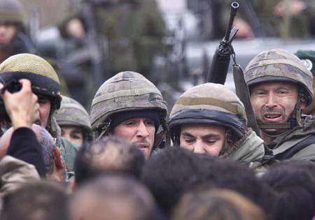 Israeli soldiers moving in on a building where Palestinian gunmen have holed up.