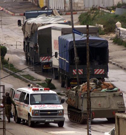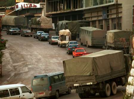 A convoy of Syrian army trucks travel along on the main Damascus road in the eastern Lebanese mountains as they are redeployed from Beirut to the Bekaa Valley on April 3, 2002. Syria began shifting the 20,000 troops it has in Lebanon on Wednesday, in an apparent bid to make them less of a target for any Israeli retaliation to attacks by Syrian-backed Hizbollah."Politics is to say you are going to do one thing while you're actually planning to do someting else - and then you do neither."