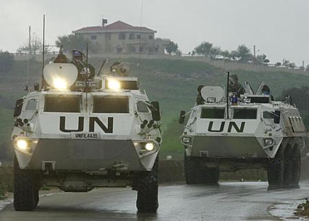 UN Peacekeeper vehicles patrol at the southern Lebanese village of Kfar Chouba, Wednesday, April 3, 2002. Israeli soldiers and Lebanese guerrillas exchanged fire for the second day in the disputed border area, keeping tensions high on Israel's northern front as fighting raged in Palestinian West Bank territories.